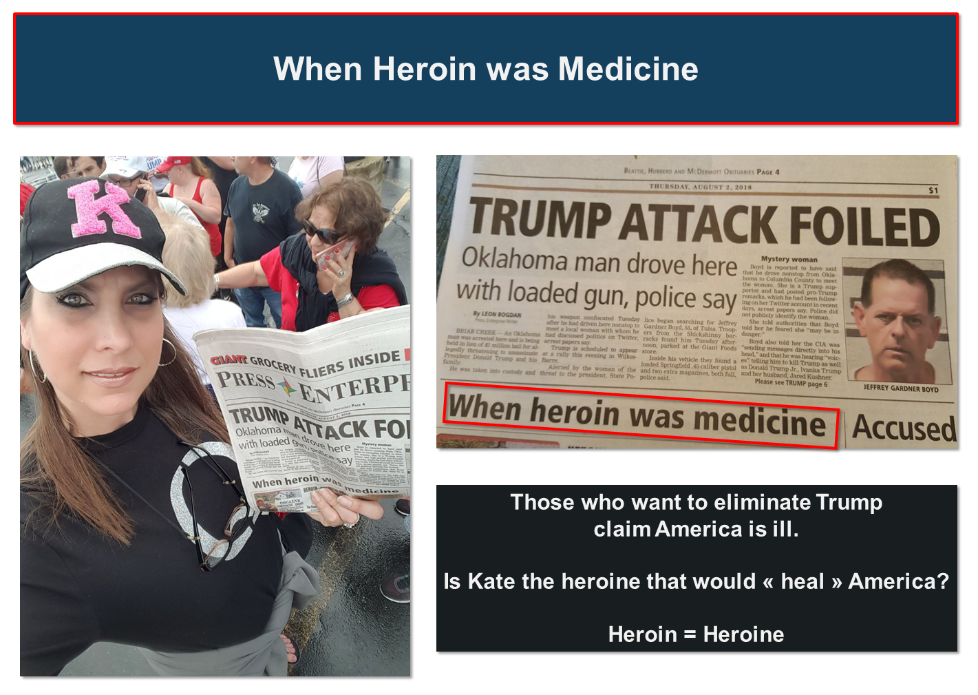 Our “heroine” then decided to go public with her story hoping it could give her privileged access to POTUS she claimed she wanted to hug: tweet. In line at the rally, she is proudly wearing a Q Tee-shirt and is holding a copy of the newspaper recounting her feats of arms: tweet. She is hoping these 2 fetishes will help her be positively recognized and facilitate her access to POTUS.
