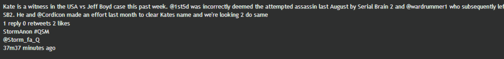Kate is a witness in the USA vs Jeff Boyd case this past week. @1st5d was incorrectly deemed the attempted assassin last August by Serial Brain 2 and @wardrummer1 who subsequently left SB2. He and @Cordicon made an effort last month to clear Kates name and we're looking 2 do same