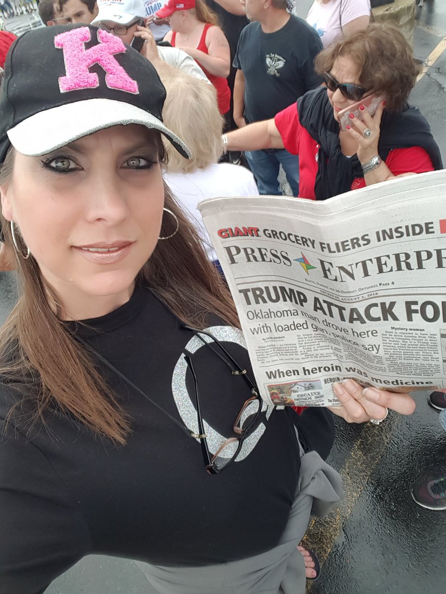 Our “heroine” then decided to go public with her story hoping it could give her privileged access to POTUS she claimed she wanted to hug: tweet. In line at the rally, she is proudly wearing a Q Tee-shirt and is holding a copy of the newspaper recounting her feats of arms: tweet. She is hoping these 2 fetishes will help her be positively recognized and facilitate her access to POTUS.