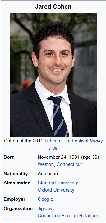 Jared Cohen (born November 24, 1981) is the CEO of Jigsaw[1] (previously Google Ideas[2]) and an Adjunct Senior Fellow at the Council on Foreign Relations.[3] Previously, he served as a member of the Secretary of State's Policy Planning Staff and as an advisor to Condoleezza Rice and later Hillary Clinton.[4] Initially brought in by Condoleezza Rice as a member of the Policy Planning Staff, he was one of a few staffers that stayed under Hillary Clinton later referenced in an article entitled "Tweeting While Tehran Burns".[5] In this capacity, he focused on counter-terrorism, counter-radicalization, Middle East/South Asia, Internet freedom, and fostering opposition in repressive countries.[6]