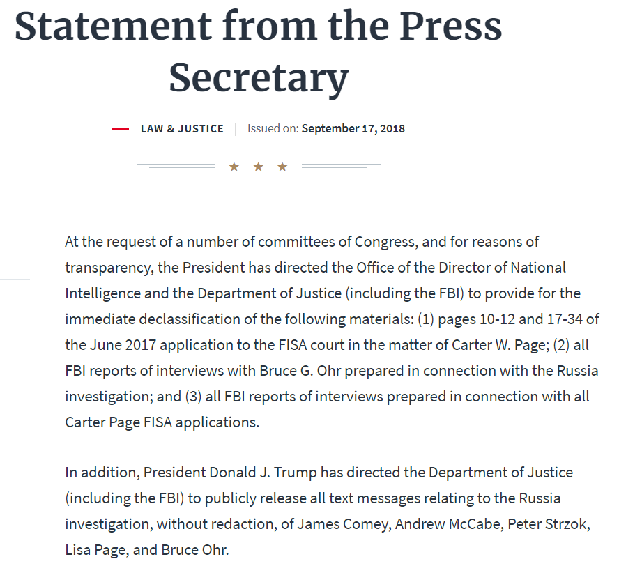 "As I've been saying for two years, there's been a brazen plot to illegally exonerate Hillary Clinton in the email case and then if she had lost, to frame Donald Trump. And that is exactly what these texts are about. Whether or not Mr. Strzok and Lisa Page and others are indicted is certainly a question people can debate, but let me just say I know there is a grand jury underway, testimony is being taken about Strzok, Page, McCabe and others involved in this case and the reason we know it is that James Baker, the former general counsel of the FBI, as turned State's evidence is fully cooperating with the Inspector General and with the Federal Grand Jury. I can assure you, Mr. Comey has been very silent in recent weeks and the reason is very simple: he knows he's going to be indicted."