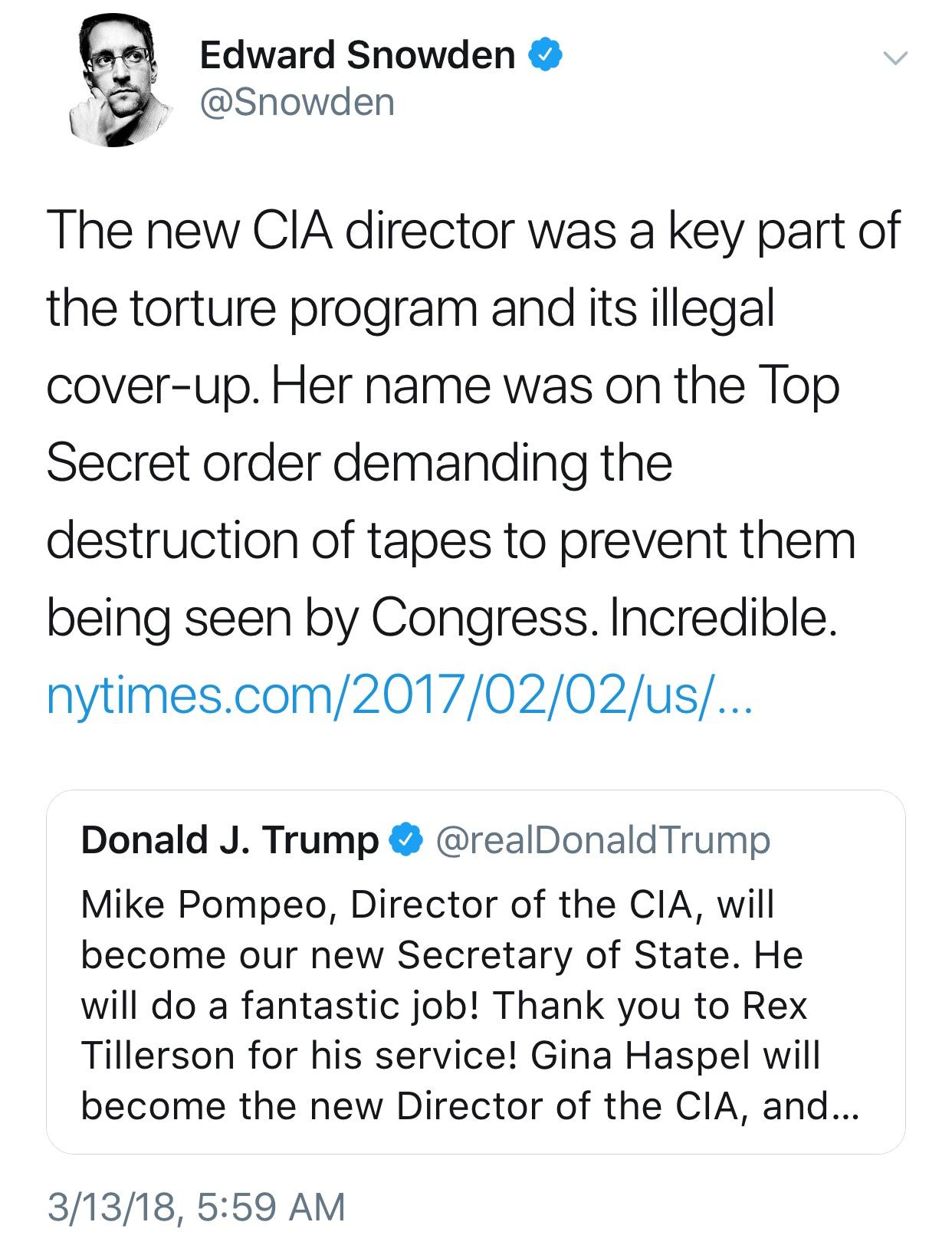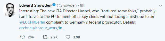 Snowden does not like the new CIA pick