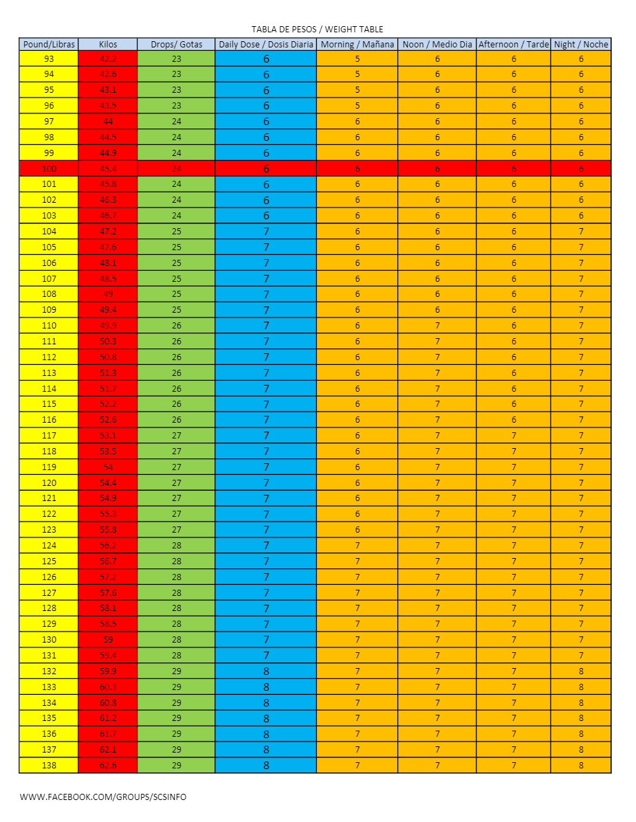 We like people to start slow w/1 drop to a few drops a day and work up to the # determined by body weight from table below.